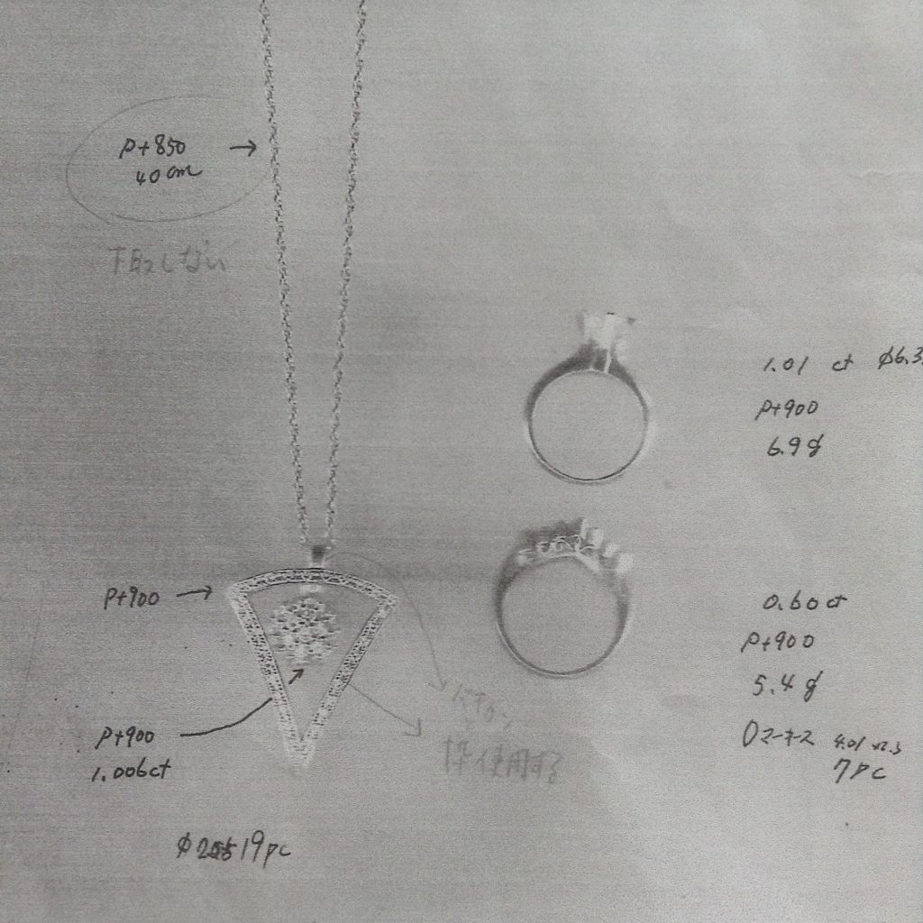 ご自身のすでに持っていらっしゃるたくさんのアイテムとうまくコーディネイトできるように譲り受けたたくさんのジュエリーの中から1ctサイズのラウンドダイアモンドとマーキースカットのダイアモンド、パヴェダイアモンドのダイアモンドのみを選定。お姉様の思い出のジュエリーも残しつつ、お客様好みのよりゴージャスなペンダントとイアリングにリモデルされました。