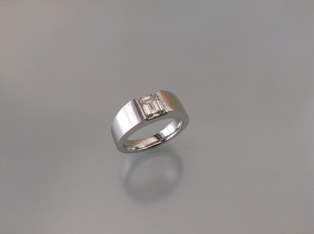 エメラルドカットのダイヤモンド(1.057ct)を主役にした、Pt900製のリングをご紹介します。