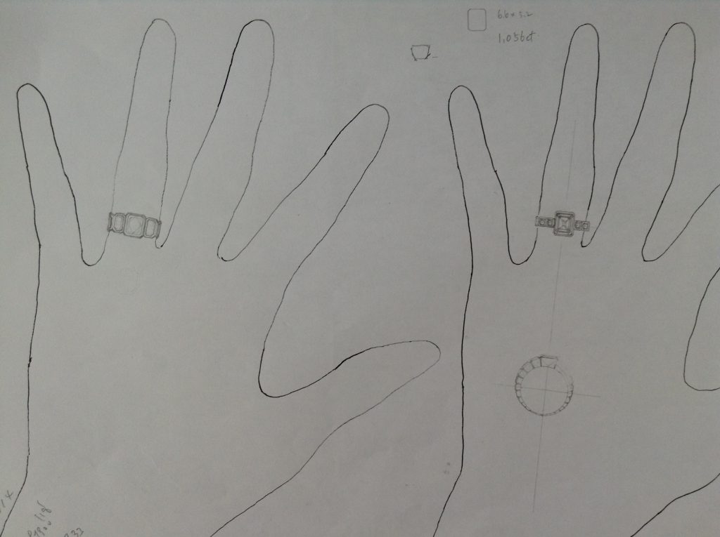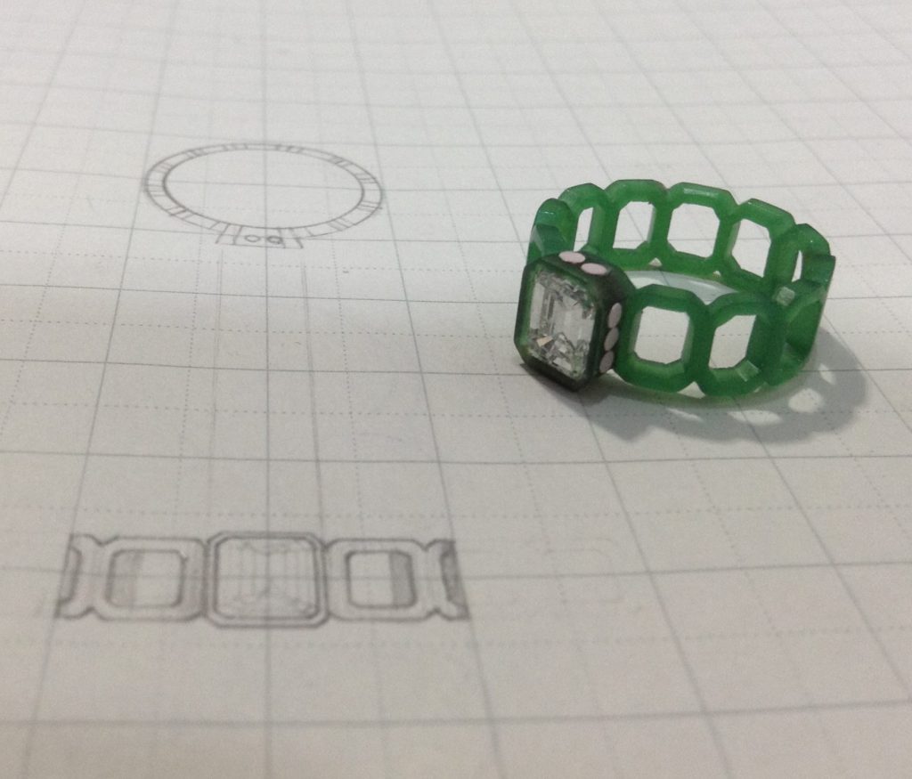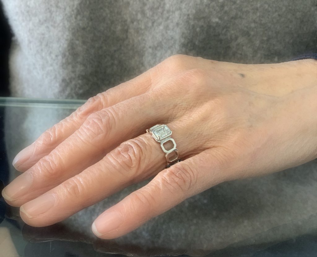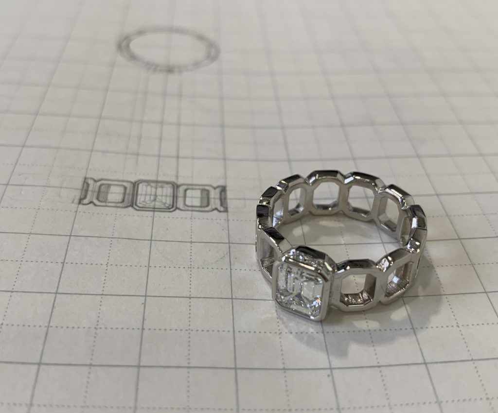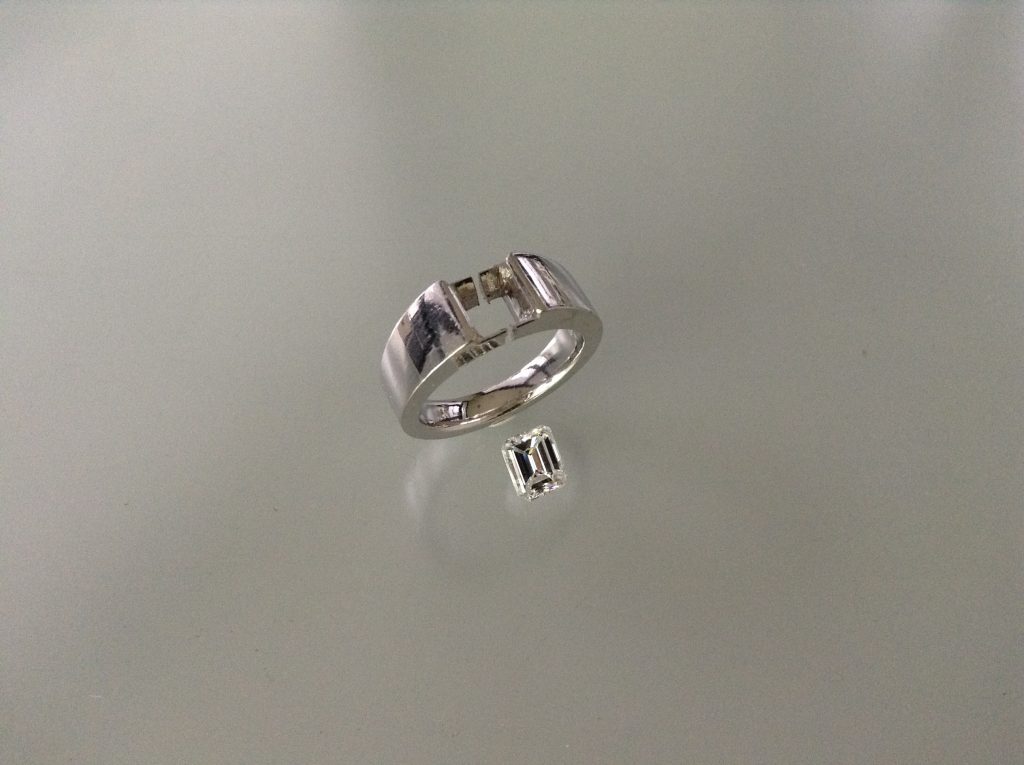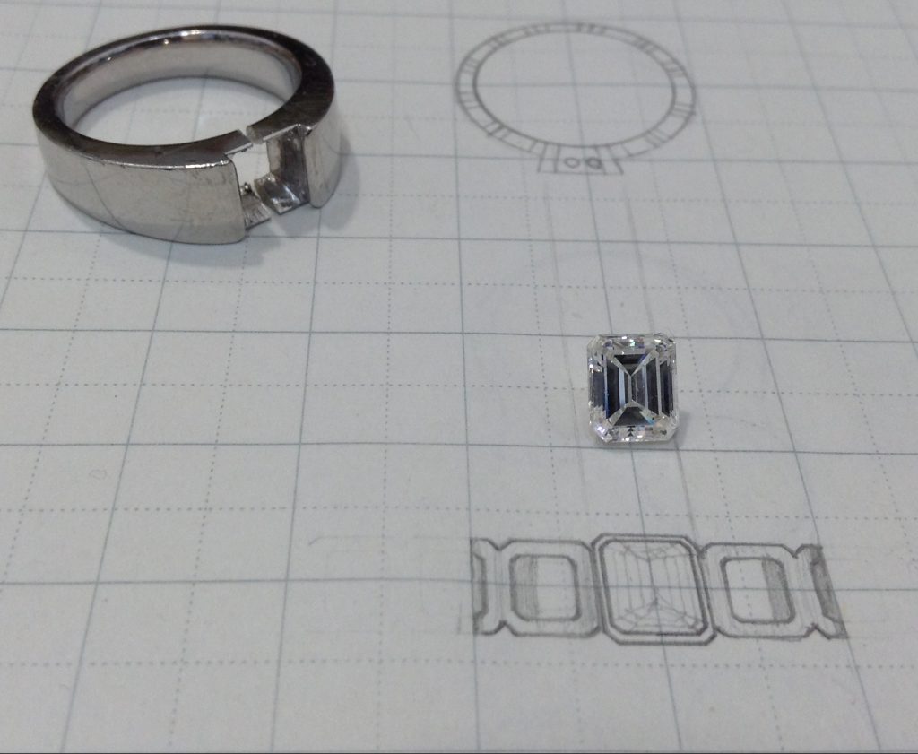 ダイヤモンドを一度枠から外してみると、エメラルドカットならではの八角形の美しさが際立ち、「この形をしっかり活かしたい」と感じました。