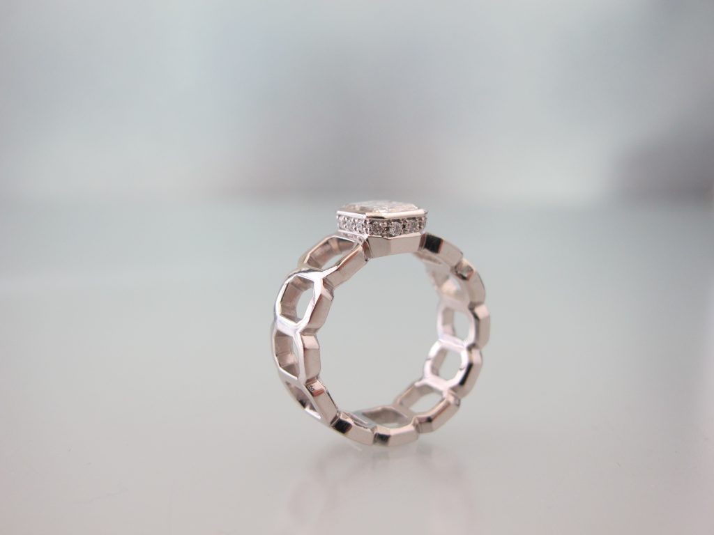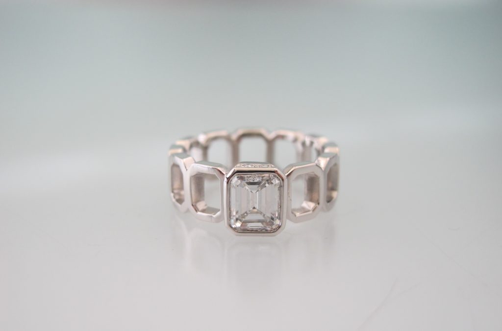 八角形の美しいエメラルドカットに合わせて、リング全体にも八角形の透かし模様を取り入れたデザインに仕上げました。こちらは、お客様がお持ち込みくださったダイヤモンドを、フジコオリジナルの透かし模様シリーズへとカスタマイズしたジュエリーリモデルの実例です。