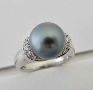 黒蝶真珠 ピーコックグリーン 11.5mm 襟リング Pt900/#15 真珠のサイズ違いでリング全体のバランスが変わり、色が違うだけで同じデザインでも雰囲気がガラリと変わります。