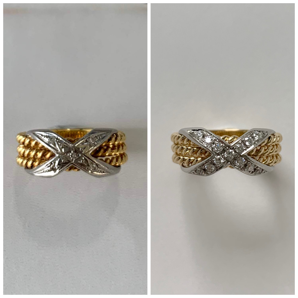 K18YGとPt900のコンビリングの中央のダイアモンドを入れ替えて欲しいというご依頼。一見よく見ないと気付かないかもしれない小さなダイアモンド。物足りない感じがするとのことで現状のダイアモンドを取り外して新たにハイクオリティのダイアに入れ替えられます。作業はただダイアを外すだけでなく再度ダイアが留められるのでプラチナ部分に損傷がないよう作業はとても慎重に行われます。幅いっぱいにぎっしりダイアが埋まって見えるよう最大限の大きさのダイアが選別され留められます。