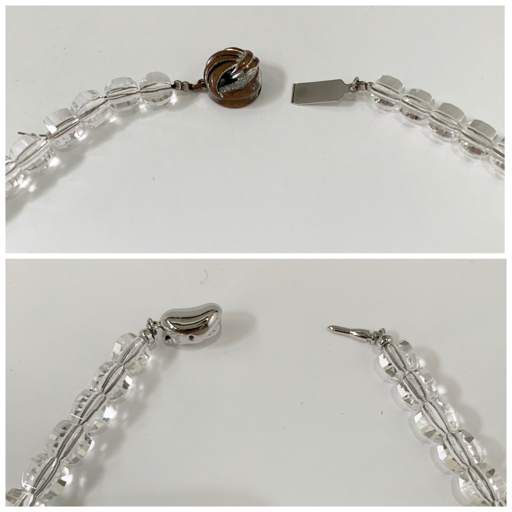譲られた古いカット水晶のネックレスのクリーニング、糸、留め具交換、お揃いで使えるピアスの作成のご依頼です。心地よく使えるネックレスにお手入れして整えます。何はともあれ汚れの洗浄第一に透明な石は曇ったり汚れが目立ちやすいもの。ネックレスに付着している皮脂や化粧品など汚れをアルカリ性の洗浄液にて超音波洗浄できれいにします。洗浄後にネックレスを解体し水晶の欠けやヒビなどの状態をチェックしつつ孔口の汚れをきれいにします。