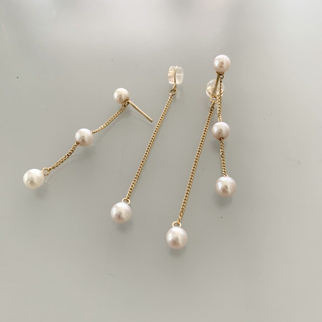 真珠のネックレスの長さを調整した時にもしいくつかの真珠が余ることがあったらオススメなのはアメリカンチェーンピアスです。アメリカンチェーンピアスチェーンを直接耳のピアス穴に通してつけるちょっと変わったタイプのピアスですが見た目がとってもおしゃれ。キャッチレスでも留まりますが淡水パールでできたピアスキャッチをつければさらにおしゃれに。K18製のチェーンピアスは3cmと5cmの2タイプ、チェーンはヴェネチアンタイプと喜平タイプの2種類ございます。ヴェネチア