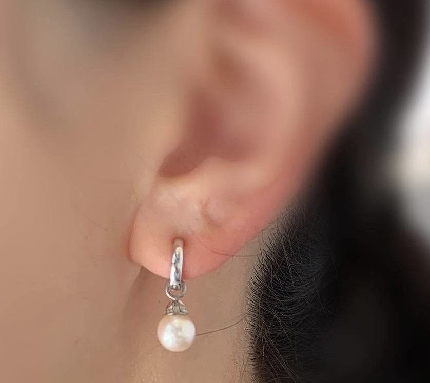 いつものシンプルなイアリングにチャームを足すことでネックレスやリングとコーディネイトできますね。