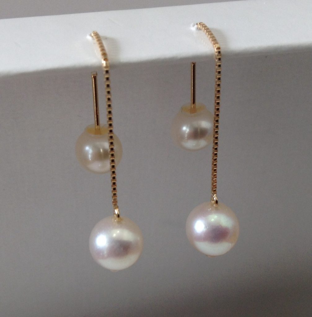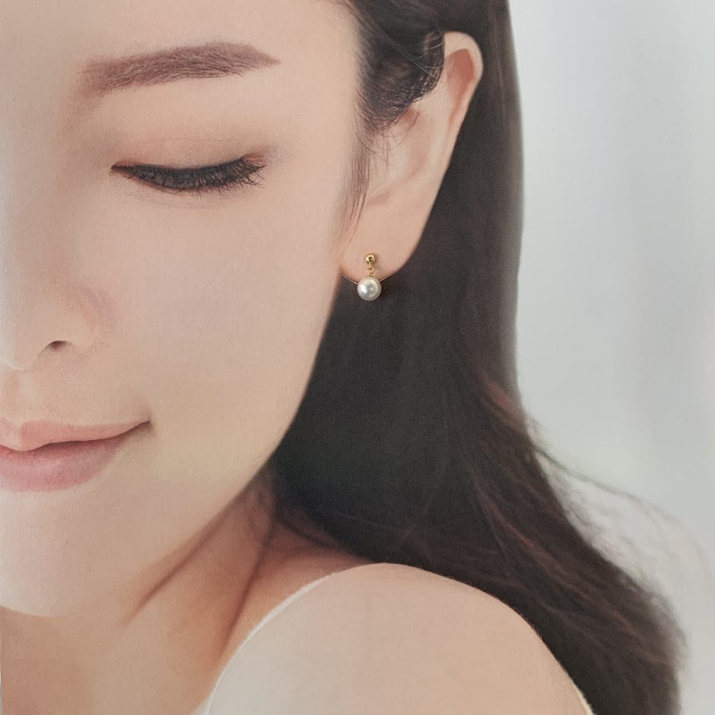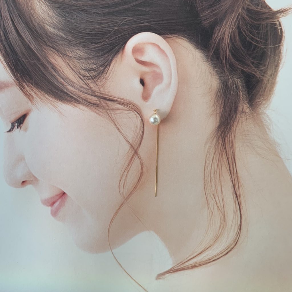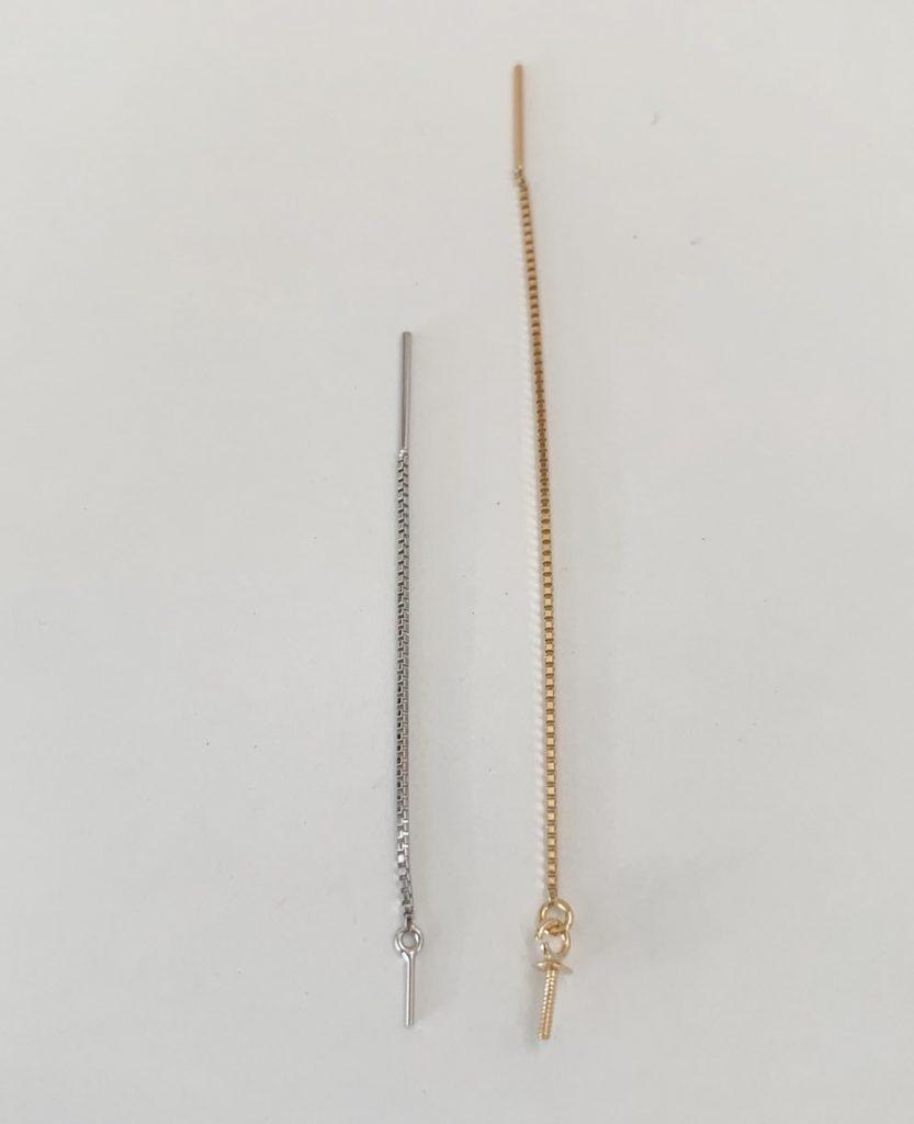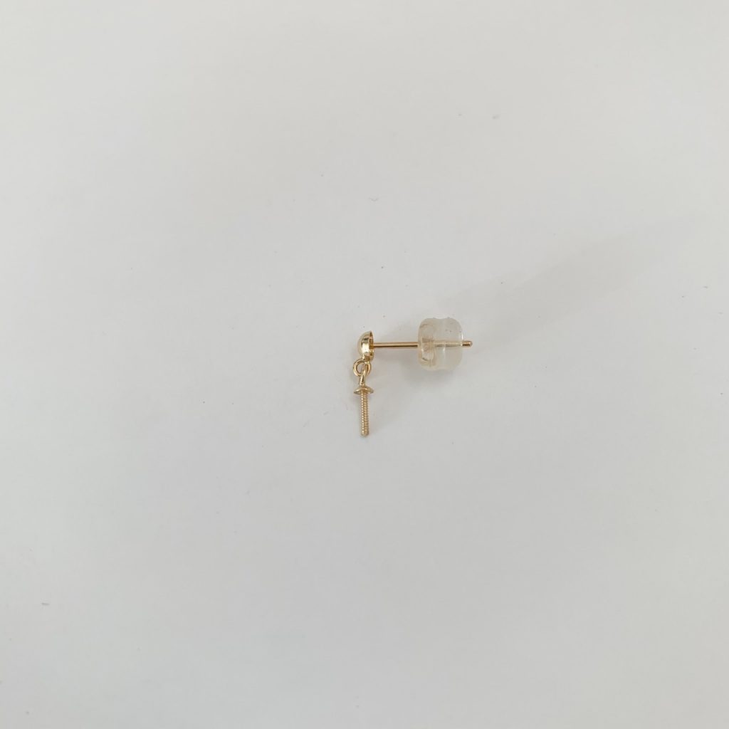 長さがは3cmと5cmの2種類、K18YGまたはK14WG製が耐久性があってオススメです。キャッチレスでお使いいただけますが淡水パールキャッチを使うと付け方のバリエーションが増えます。