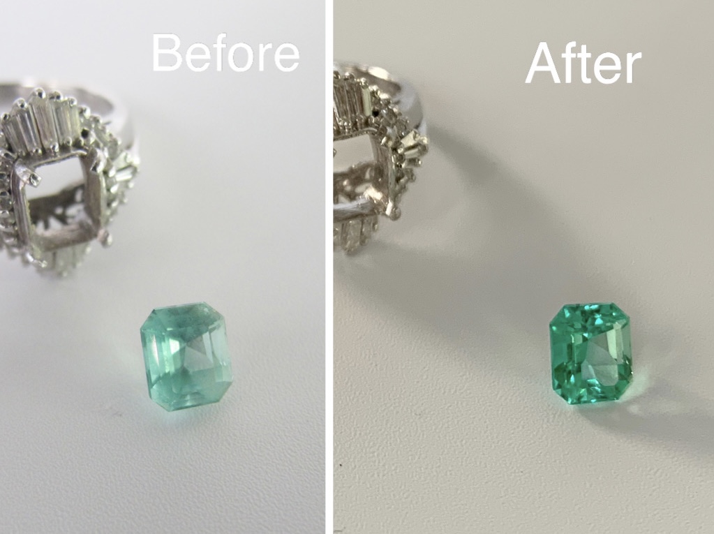 下画像のエメラルドリングの場合、一見傷んでいないように見えますが外されたエメラルドを全面磨き直してみると見事なツヤが復活しました。