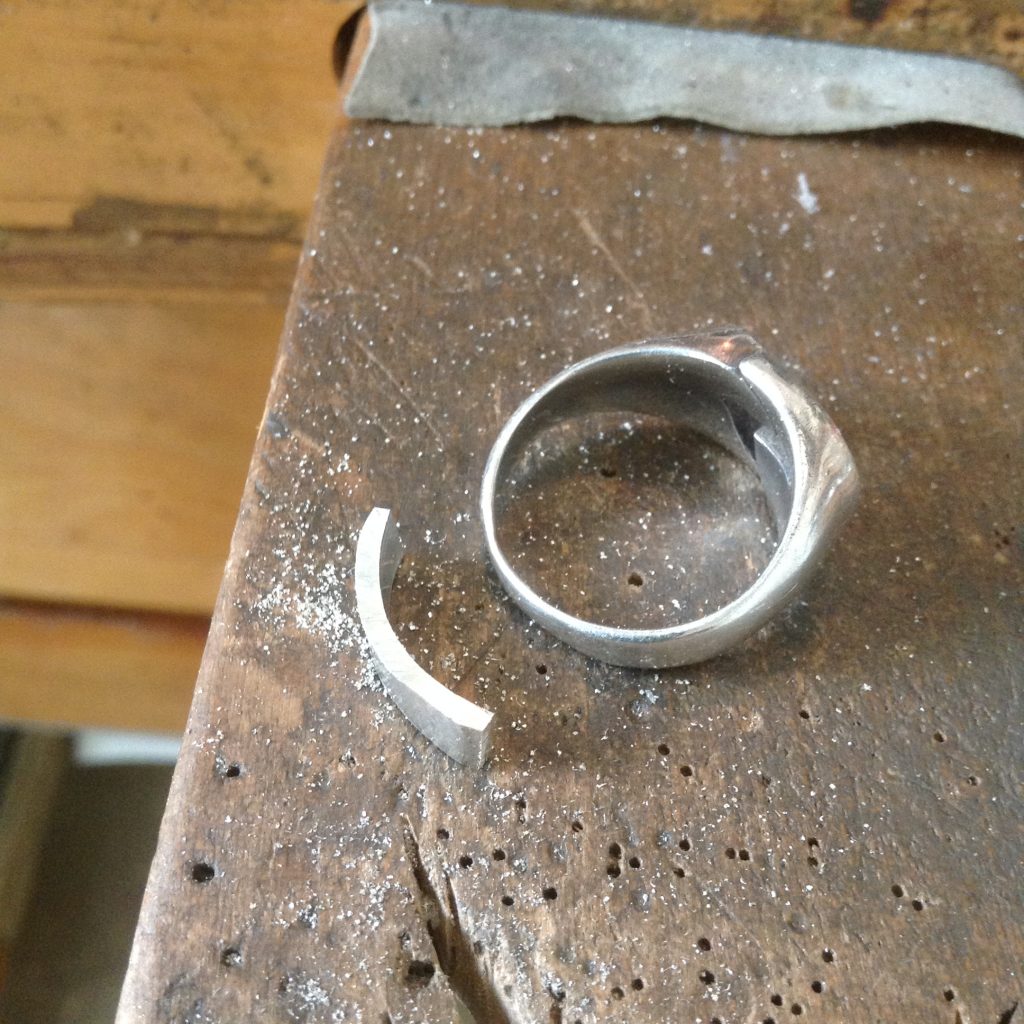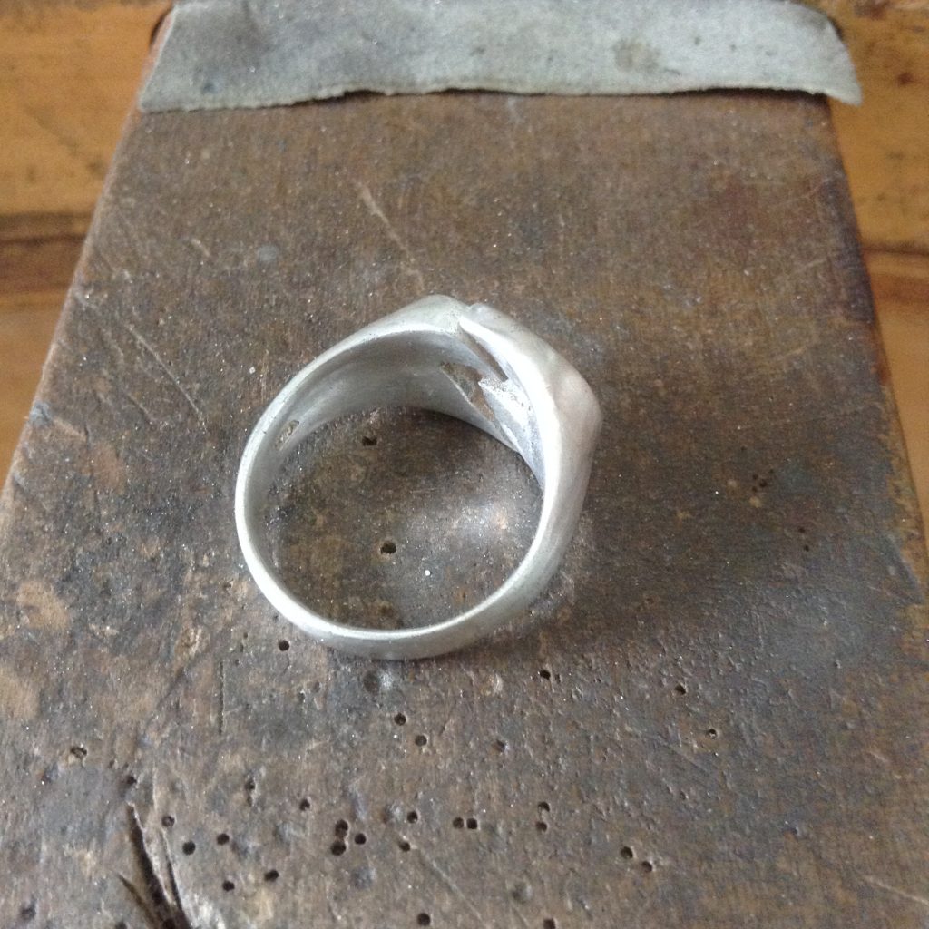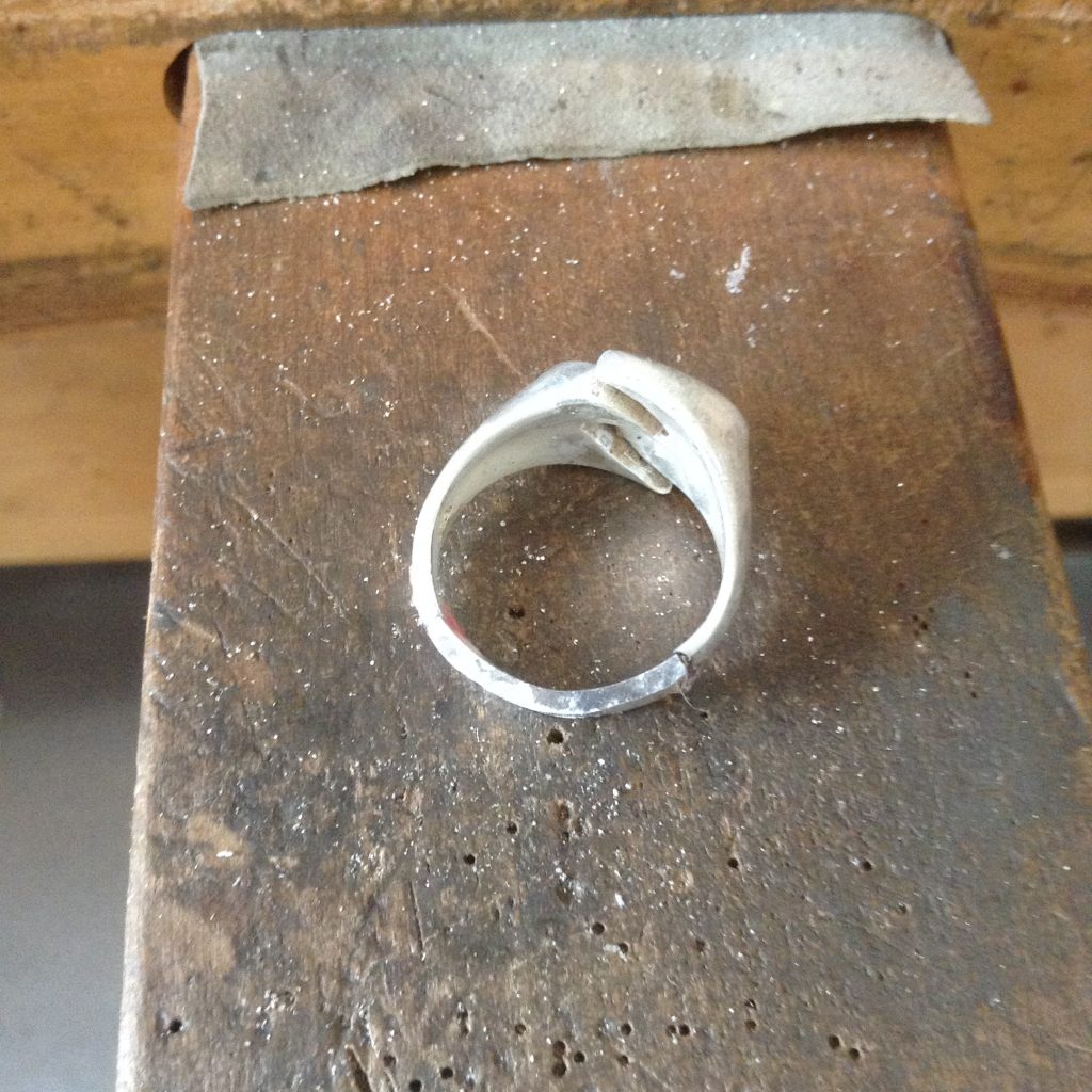 シルバーリングのお直し。一見なんの問題もなさそうな感じに見えますが、リング部分の地金が薄く、真ん中がつながっていないデザインなので着ける度に広がって変形してしまうとのこと。リング部分を厚くして欲しいとのご注文。