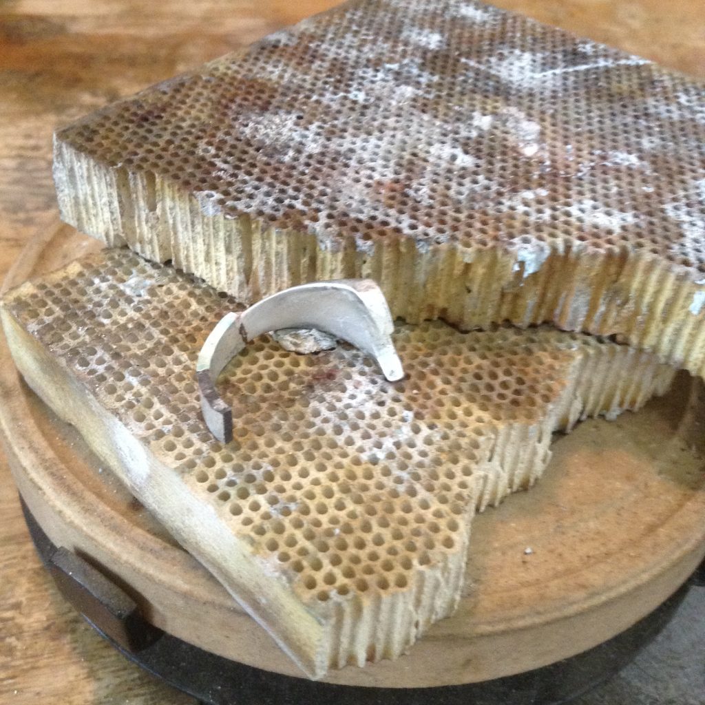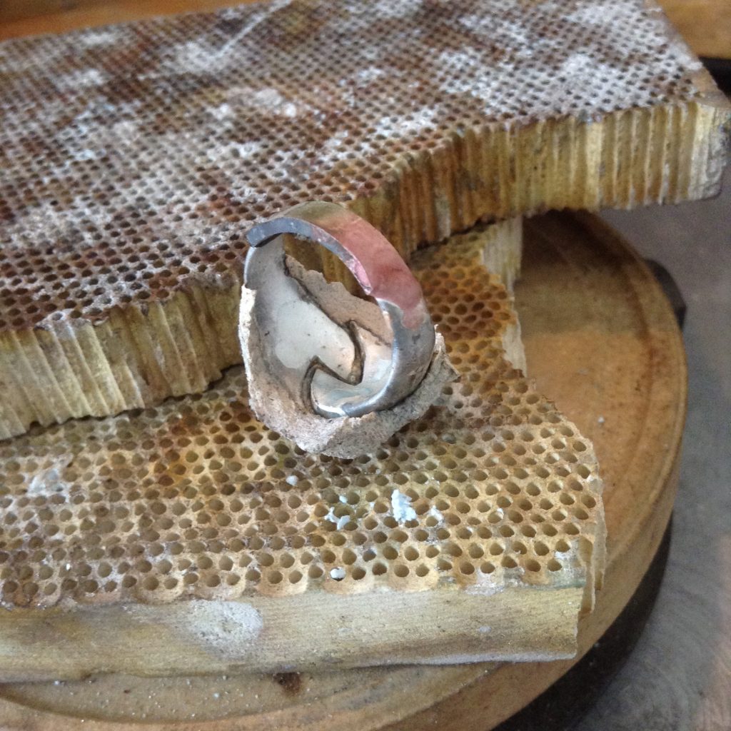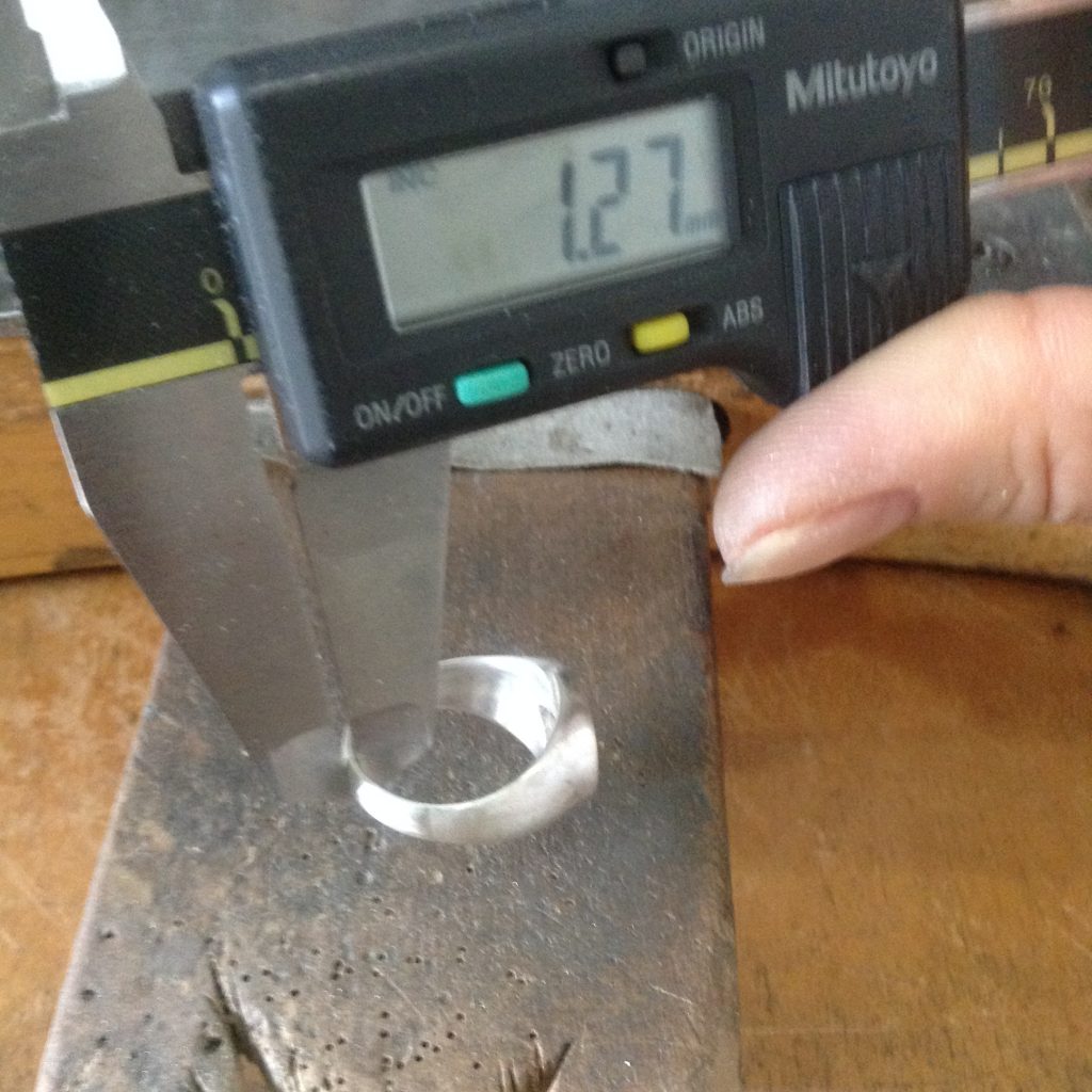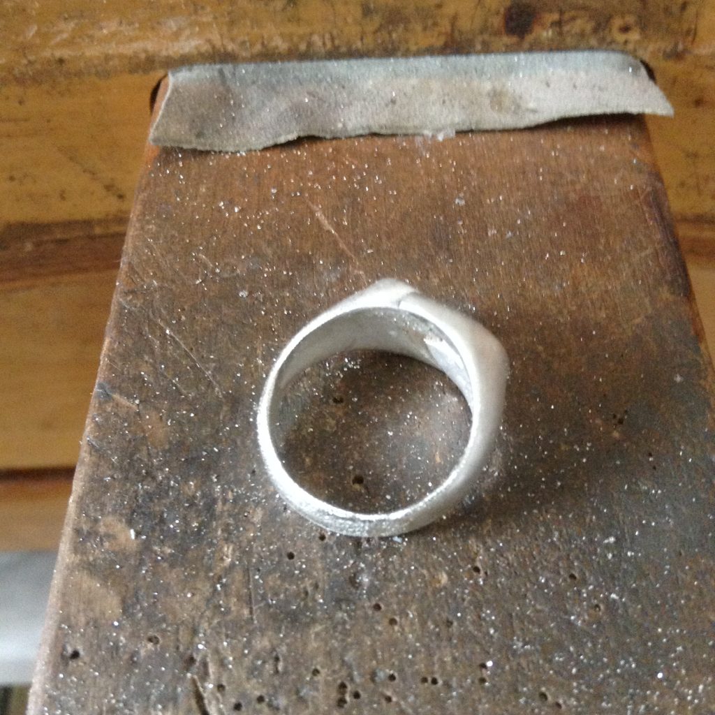 シルバーリングのお直し。一見なんの問題もなさそうな感じに見えますが、リング部分の地金が薄く、真ん中がつながっていないデザインなので着ける度に広がって変形してしまうとのこと。リング部分を厚くして欲しいとのご注文。